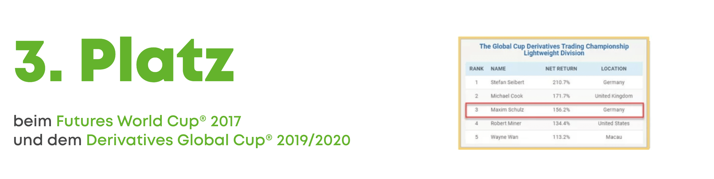 Max Schulz ist der Grund wieso über 600+ erfolgreiche Teilnehmer ihr Kapital am Finanzmarkt nachhaltig vermehren. Er besitzt über 8 Jahre Erfahrung an den Futuremärkten und weiß genau, wie man in diesen Märkten sein Kapital vermehrt. Der Gründer von Insider Week belegte außerdem 3x hintereinander einen Podiumsplatz beim World Cup Championship of Future Trading.