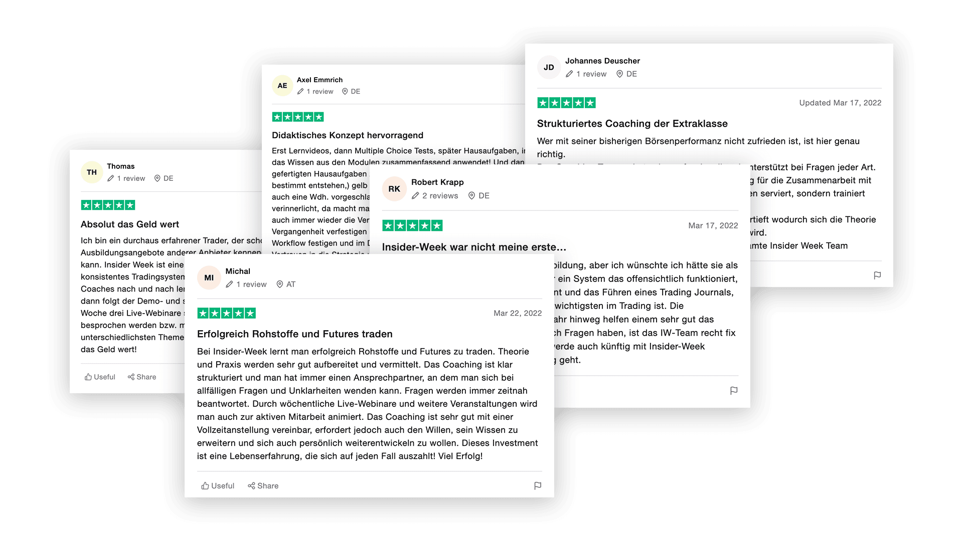 Allein über 45 erfolgreiche Teilnehmer absolvieren eine individuelle Ausbildung bei dem Team von Insider Week und Max Schulz. Von Anfängern über Fortgeschrittene bis hin zu proftablen Tradern sind alle dabei.