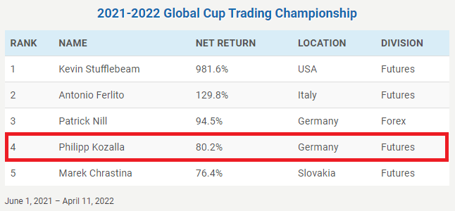 Derzeitige Zwischenplatzierung: Platz 4 bei der Trading Weltmeisterschaft 2021/2022 mit 80% Performance
